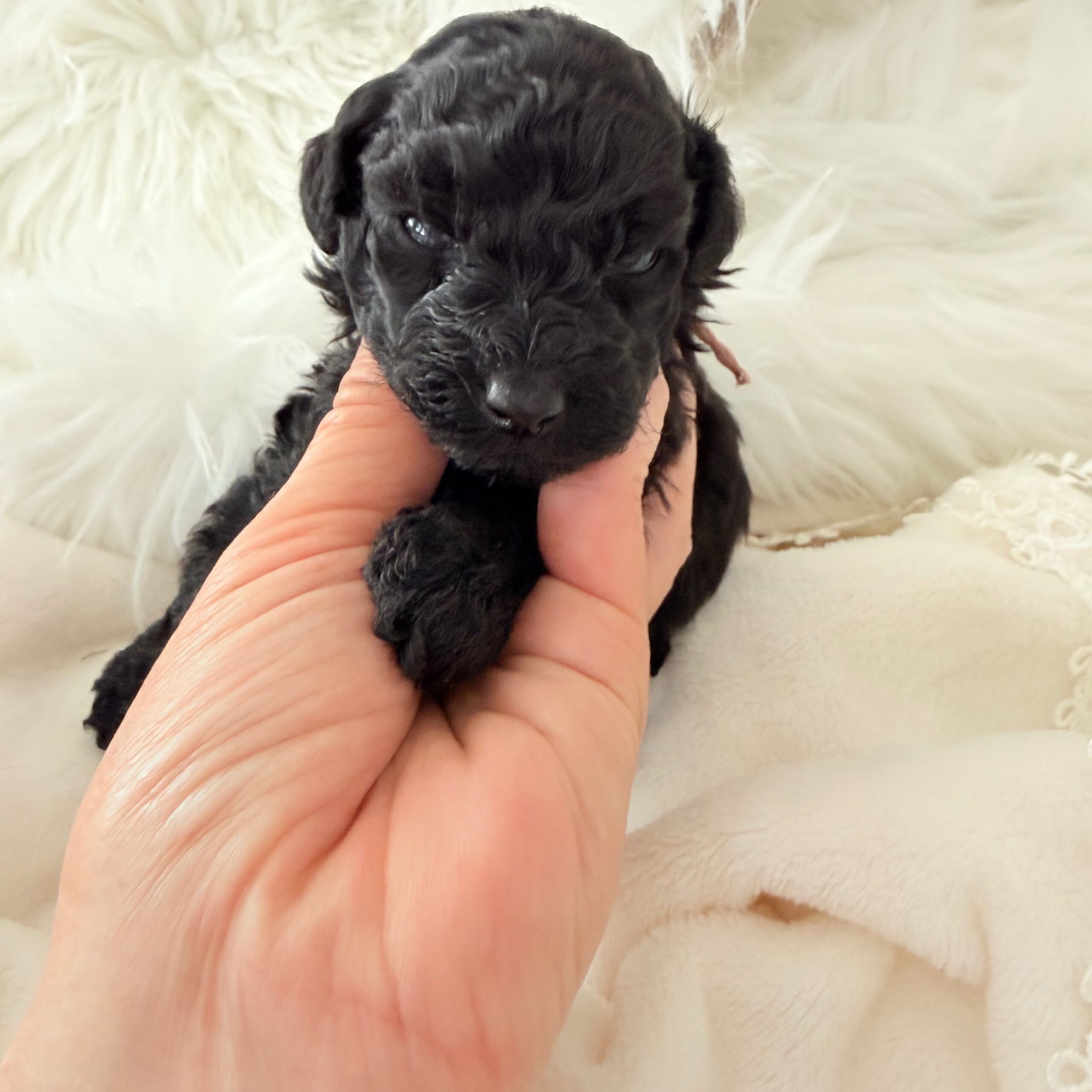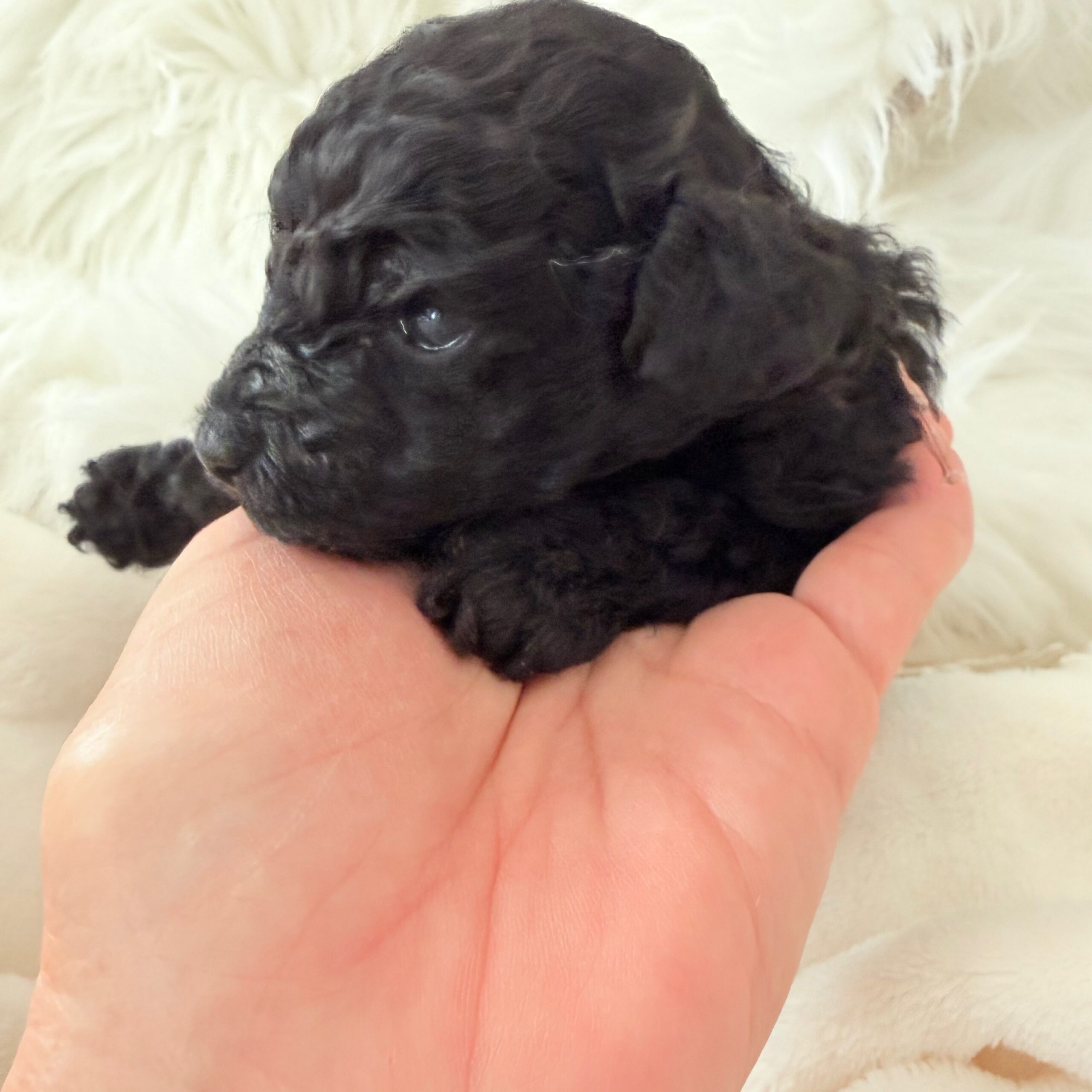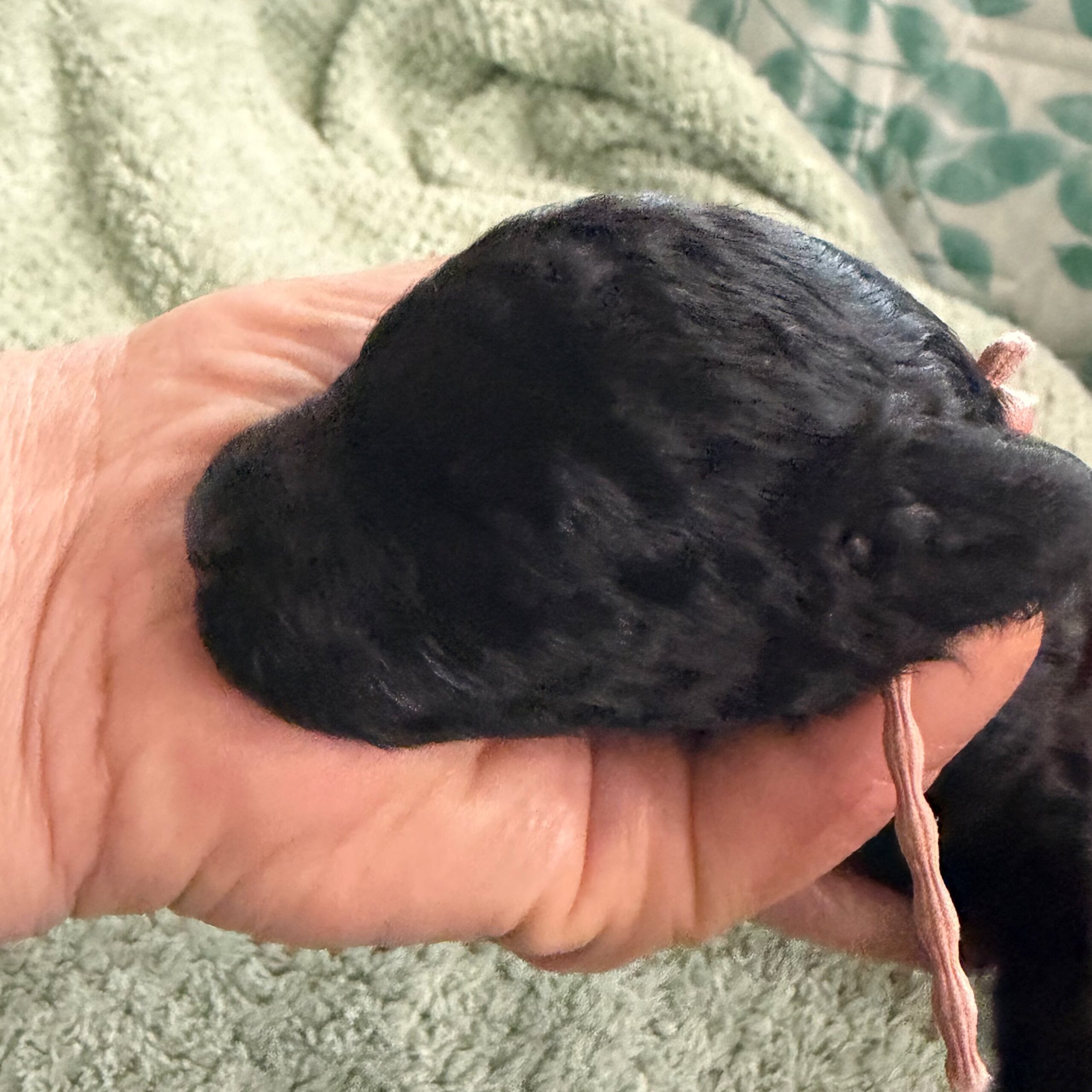 まだ目が開いてないので ただの黒い塊ですが よく見るとほかのブラックの子たちとの顔の差がわかりますよ。